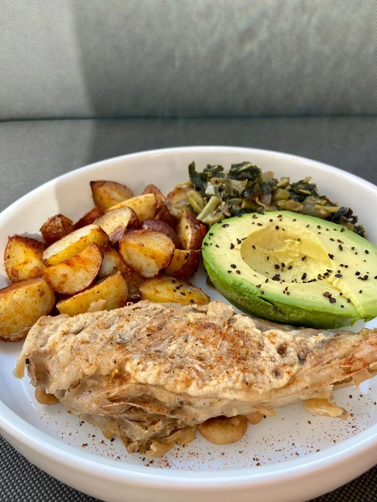 Vegan Fried Fish with Oven Roasted Red Potatoes Avocado and Calaloo